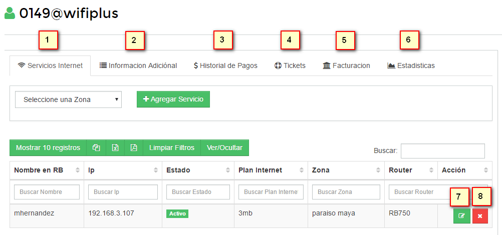 Si necesitamos cambiar de Ip, plan de internet,equipos wifi o algún comentario damos click en el icono verde(Numero 7). Para eliminar el servicio, damos click en el icono rojo (Numero 8). Nota si el cliente solo tiene un servicio, se eliminara el servicio + el cliente + facturas.