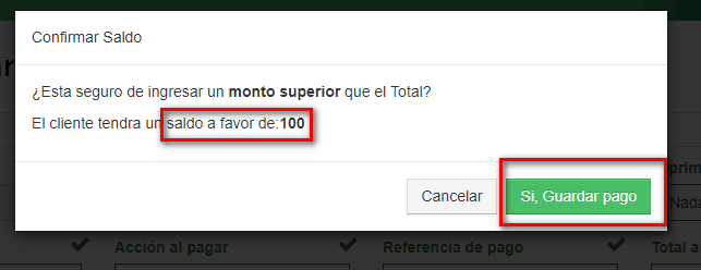 2El monto original es de $300 e ingresamos un monto de $400 pesos. El saldo a favor del cliente sera de $100 pesos. Nos saldra una ventana para confirmar la operación.