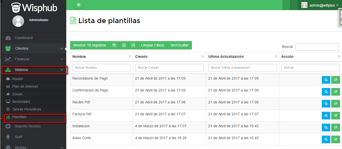 En esta sección podemos cambiar el nombre y editar ciertas plantillas que ya están predeterminadas en el sistema.