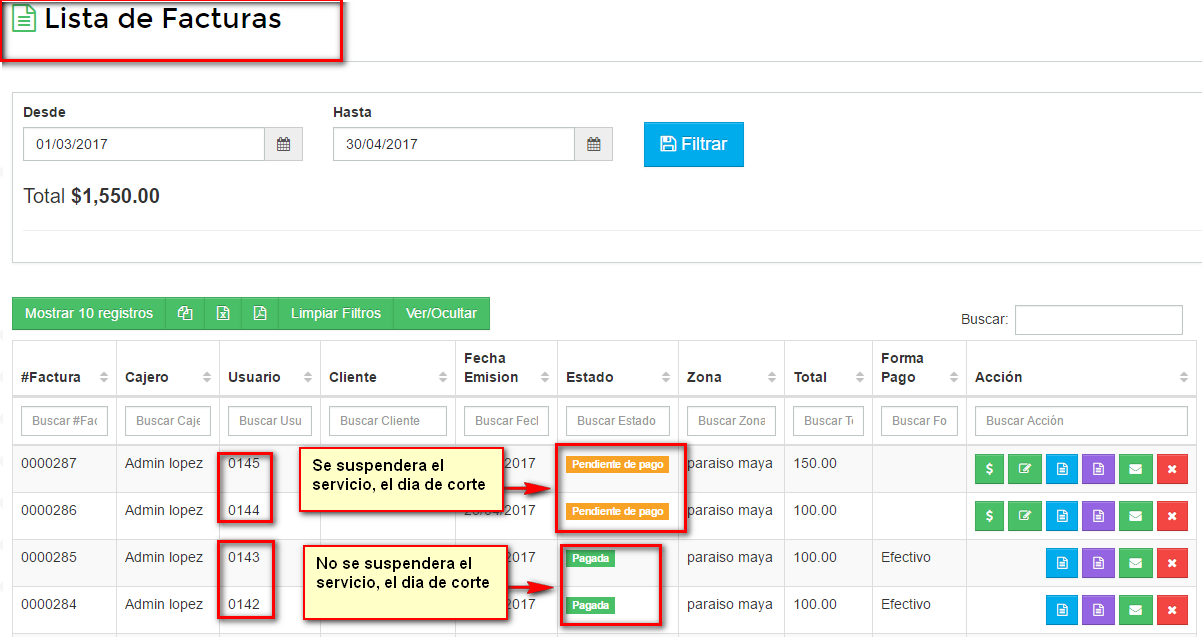 3.-Crear Factura: Día en que wisphub va a generar las facturas. Una vez generadas las facturas es importante ir registrando los pagos de los clientes, para evitar que se aplique el corte a dichos clientes que hayan pagado.